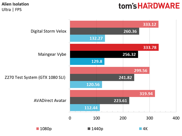 The Maingear Vybe manages to upend the Velox in Alien: Isolation at 1920 x 1080, where the average framerate is limited by CPU performance. The same slight (nearly negligible) performance lead we saw in the 3DMark Fire Strike Physics tests carries the Vybe to the narrow 1080p win, but once the graphics start to play a larger role at higher resolutions, we see the Digital Storm system outperform the Vybe by a small fraction, thanks to its higher GPU overclock.