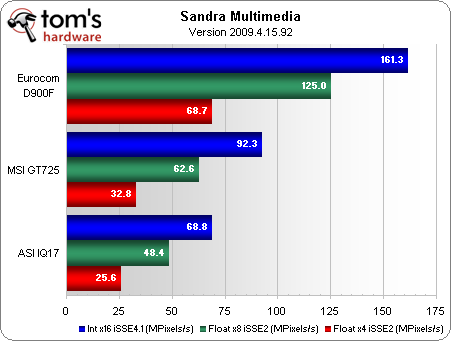 Sandra Arithmetic and Multimedia shows how the D900F’s use of a desktop Core i7 processor skews the comparison. A Clarksfield-based setup would likely meld the best of both worlds with a power-optimized Nehalem design.