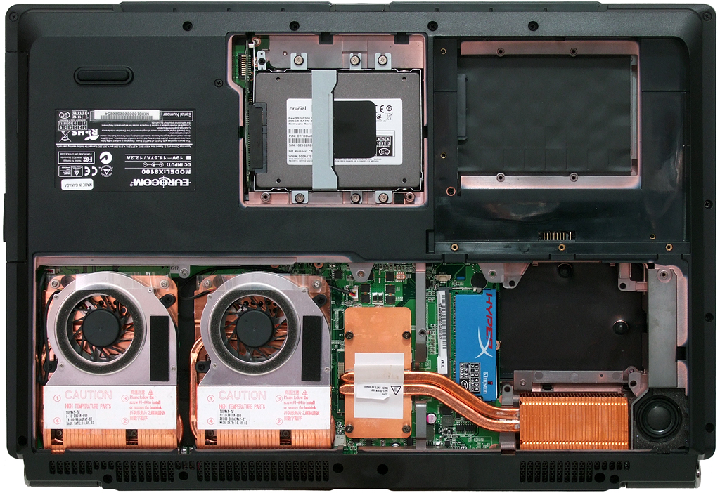 GeForce GTX 480M buyers will find the second card bay covered a second fan and heat sink. The GTX 480M’s lofty power consumption requires two sinks and two fans to cool a single GPU. A GF104-based mobile GPU could help Nvidia’s reduce heat while increasing performance beyond that of an underclocked GTX 465.