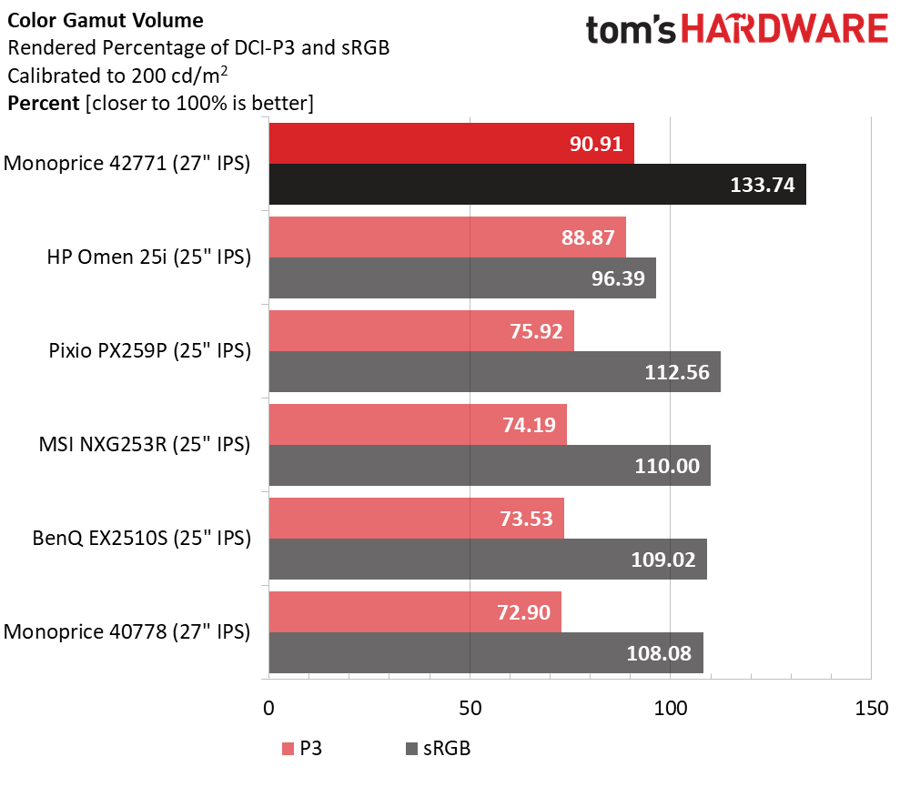 We noted earlier that FHD monitors rarely come with wide color gamuts. You can see here that the only other screen in the Dark Matter 27 42771’s league is the HP. And Monoprice manages to crack the 90% coverage barrier which plenty of extended color screens fail to do. There is no sRGB option, so we calculated that coverage at 133.74%. SDR games will be very colorful which will be to most users’ liking. If you’re a purist that must stick to sRGB for SDR content, this monitor is not for you. But since there is no HDR here, those titles will look good despite a lower dynamic range.