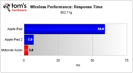 Now consider that latency plus processing time equals response time. This is where the Xoom holds an advantage over the iPad 2. Even though Motorola uses the same 802.11a/b/g Wi-Fi + Bluetooth 2.1 controller (Broadcom's BCM4329) as both iPads, the Xoom places a processing priority on network tasks, so it benefits from better response time and better throughput. However, Chrome seems to have a bigger processing overhead, so there's basically no speed advantage in Web page rendering.