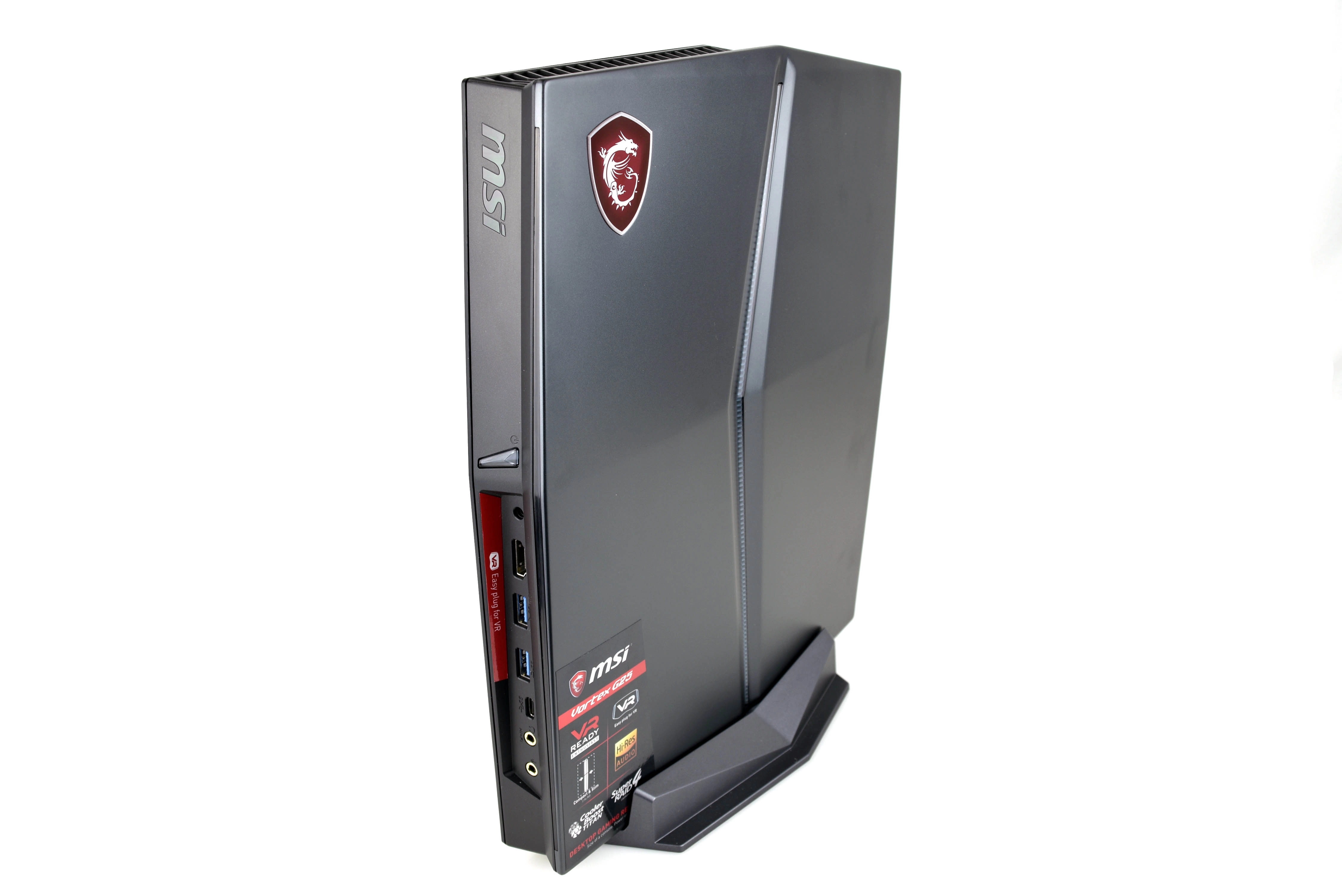 The MSI G25 Vortex 8RD is a Core i5-8400 and GTX 1060-equipped, console-size gaming PC that was designed specifically for the living room. The hardware under the hood is VR-ready, and it’s easy to connect an HMD with the front HDMI port. There’s no abundance of USB connectivity (you get only four Type-A ports), and if an Oculus Rift with Touch (which requires three USB Type-A ports at minimum) is to be paired with the Vortex, you’ll have to either settle for one Type-A port or some Type-C to Type-A adapters to connect your peripherals, or use a Bluetooth keyboard and mouse.