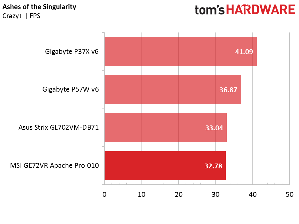 In Ashes of the Singularity the Apache Pro isn’t hindered much by its lack of memory. The difference between the Apache Pro and the 16GB systems is only 12% at most, which only equates to a few frames. System performance is crippled in general in Ashes, which favors more CPU cores. Even the Gigabyte P37X, which performs about 25% higher thanks to its GTX 1070, still doesn’t perform well enough to maintain 60 FPS on average.