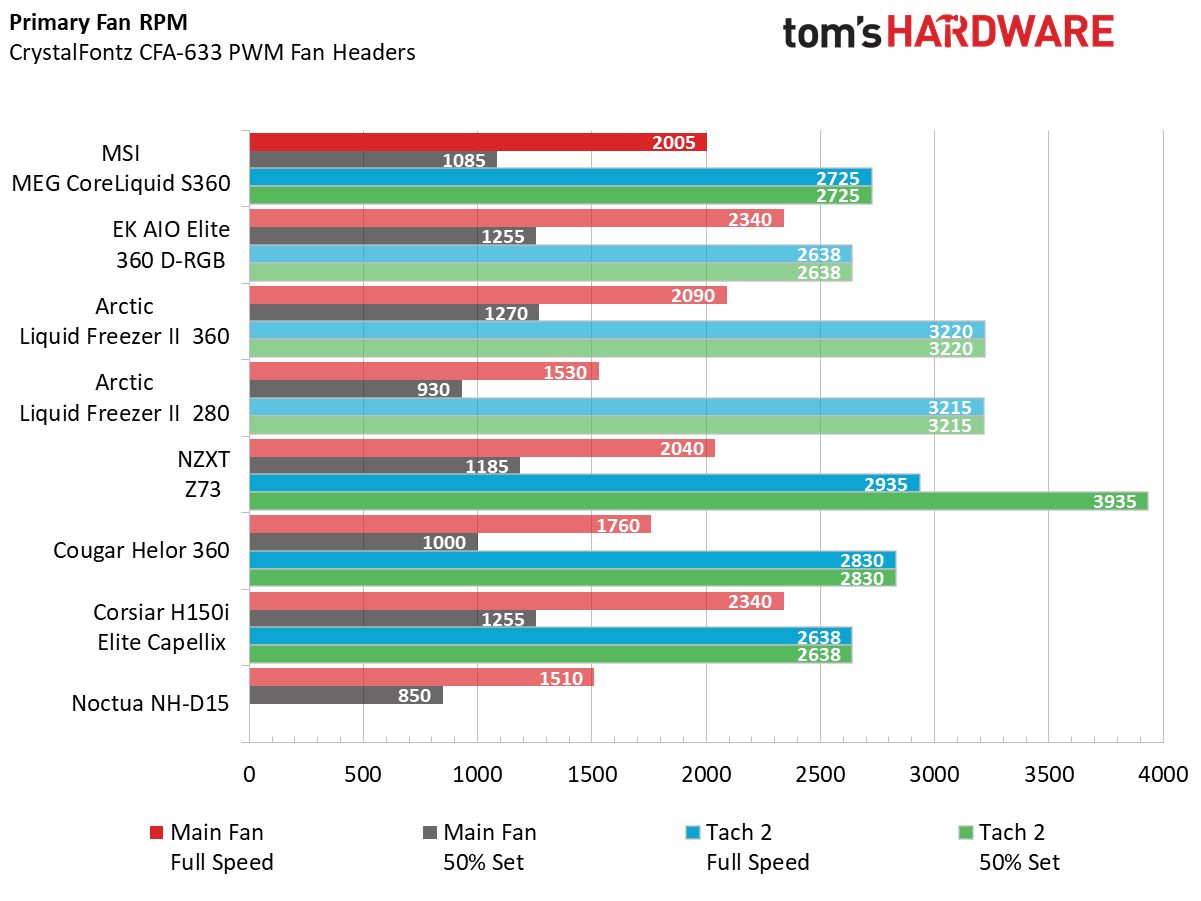 Fans and pump speeds of the MSI MEG CoreLiquid S360 are similar to others in this performance cooling segment, but this shows an interesting trend: Most high-performance 360 AIOs are making use of strong, 1800+ RPM fans with a focus on static pressure to move air effectively over the radiator they support. Obviously, the Arctic Liquid Freezer II 280 features 140mm fans, which traditionally are slower spinning, but as we see here, not by much.