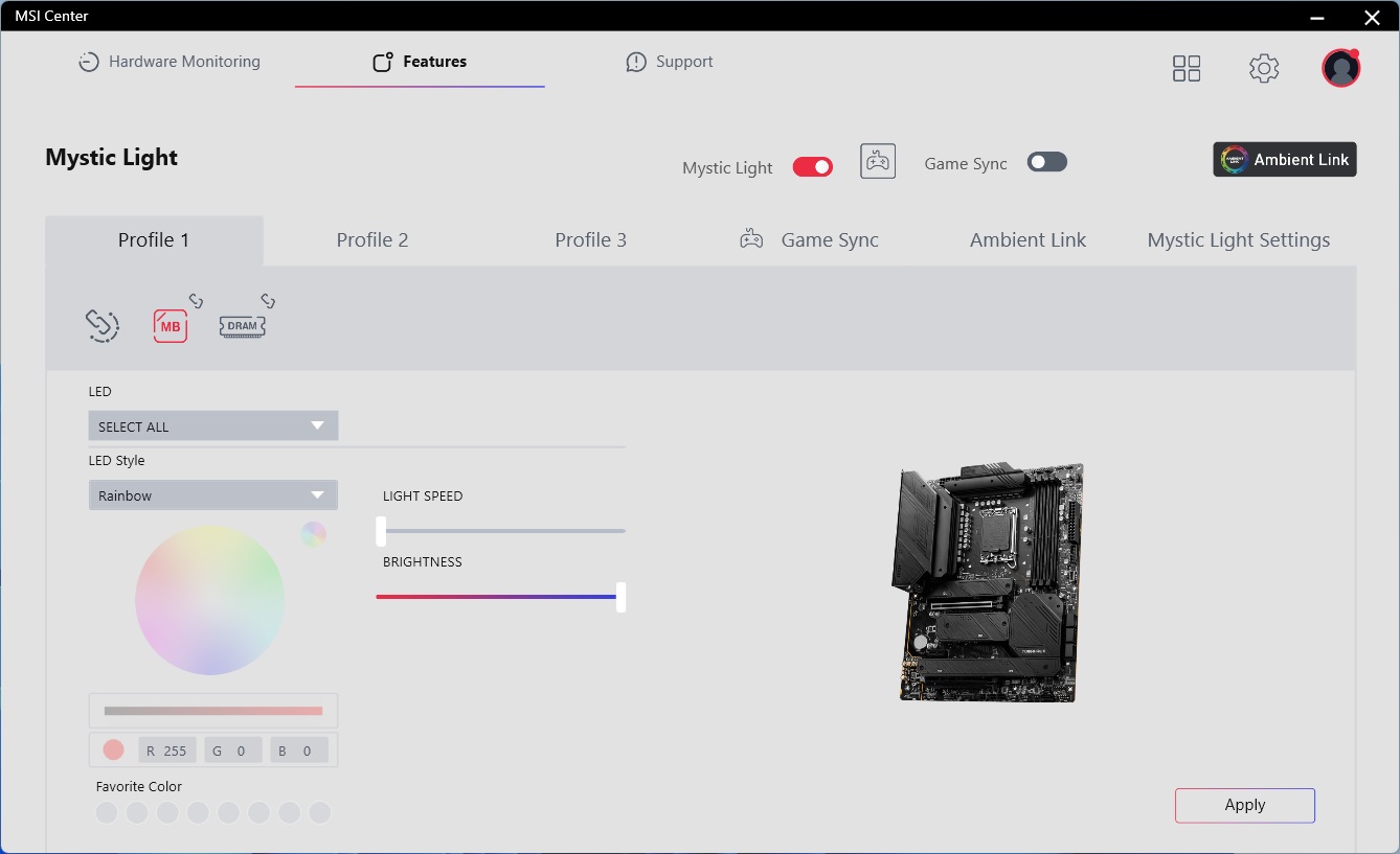 MSI has a single utility, MSI Center, that covers quite a bit of functionality. From hardware monitoring to RGB control with Mystic Light, there are many applets within the software and a one-stop shop to download all of their utilities. I wish there were some overclocking options, however. But for those looking to use the Gamebar feature, Super Charger, or any other utilities MSI offers will all be at your fingertips in MSI Center.