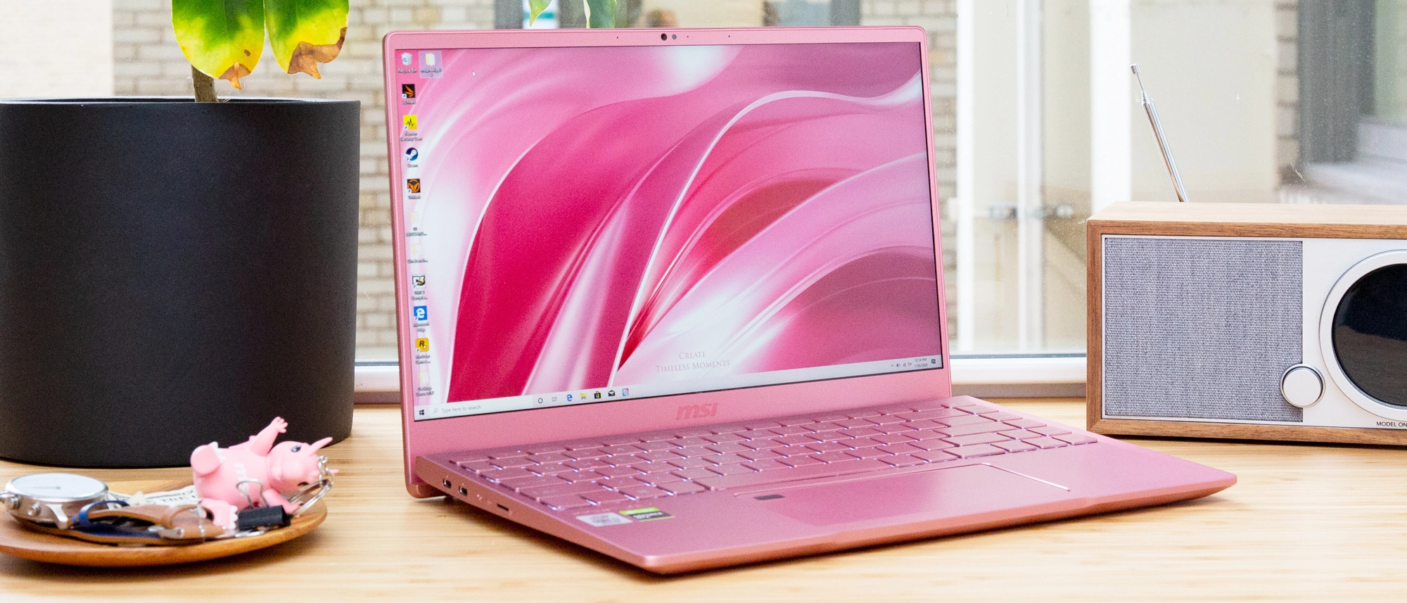 Thin pink bezels surround the display, and MSI’s logo on the bottom is also tone-on-tone and barely noticeable. The keyboard and deck are the same shade, and the keys have a surprisingly bold, cartoonish font. The keyboard has white backlighting and the fingerprint reader on the keypad is black, but otherwise this is entirely blushed.