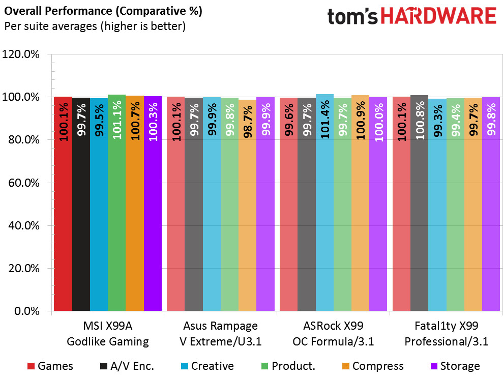 We're looking for oddities in the bench scores. Boring benchmarks are good benchmarks for motherboards. Dramatic score leads are due to motherboards cheating with hidden clock boosts while a board lagging behind is usually a configuration conflict.