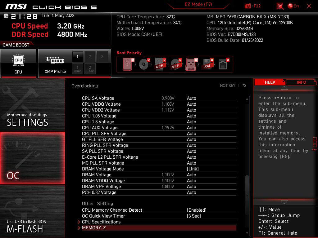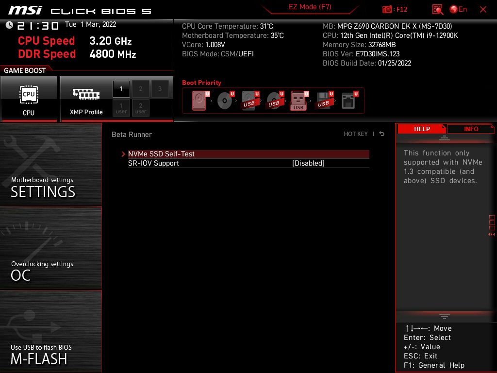 Like the other MSI BIOS configurations, you start with an informational EZ Mode that allows editing of some high-level functions, including enabling XMP profiles, adjusting fan speeds, and more. The main menu is informational up top, while the bottom two-thirds is where the adjustments happen. You select the section you want on the left or right sides, and the details show in the middle. You don’t have to dig down several screens to reach the overclocking options, as they are mostly on the main page. Some digging is inevitable, but overall we find this BIOS full of options and easy to read and get around.