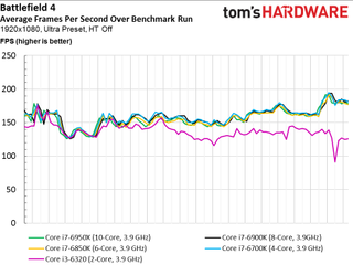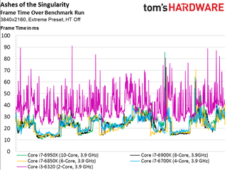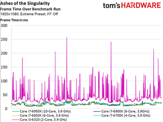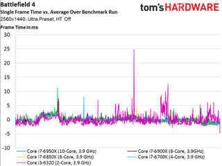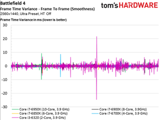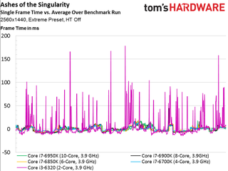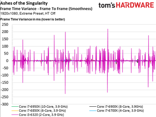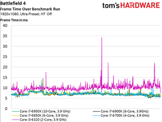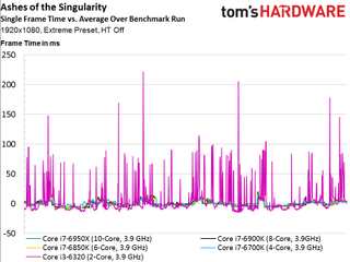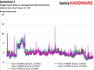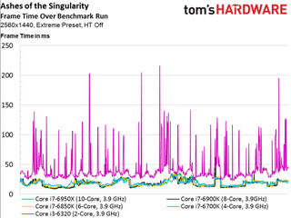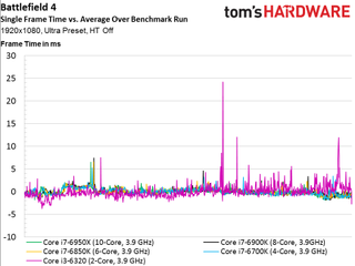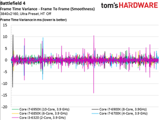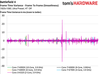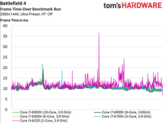 As such, we see no scaling whatsoever above four cores, even if the game is claimed to utilize additional host processing resources (and it certainly does in the multi-player campaign, at least). The only data point that does stand out is our simulated dual-core Skylake-based CPU that lags the rest of the field and demonstrates much higher frame times throughout the 100-second recording.