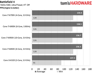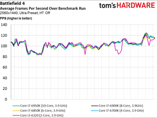 Shifting from 1920x1080 to 2560x1440 is enough to erode away our 10-core sample’s gains (a ~2% lead shrinks to less than 1%). And instead of being >17% faster than the quad-core Skylake config, it’s now 8% quicker. This is a resolution a GTX 1080 is well suited for, so our results are more relatable to real-world gaming.