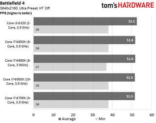 By the time we get to 3840x2160, there’s no longer a quantifiable reason to pair the GeForce GTX 1080 with a 10-core CPU. In fact, our modified Core i7-6950X is in second-to-last place, though for all intents and purposes, the top four finishers are tied.