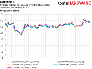 Stepping up to 4K is the great equalizer. Our benchmark on rails shows all five core configurations in a similar light, and even the frame time spikes aren’t as numerous or problematic. By this resolution, graphics processing is clearly the limiting factor in our performance measurement.