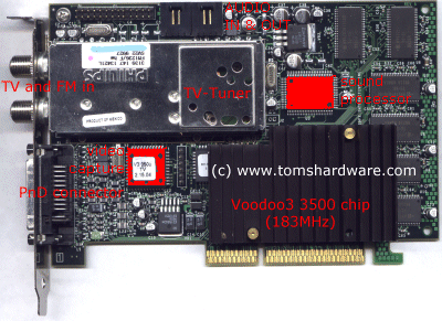This figure shows you the American version of the Voodoo3 3500TV. This has two separate coax inputs for television and FM radio. The European version excludes the FM radio tuner, so you can only watch cable television. Your internal CD-ROM or DVD drive is connected to the internal audio IN/OUT connectors. The silver box is the Philips TV tuner. The Voodoo3 chip with an internal 350 MHz RAMDAC is clocked at 183 MHz and is located under the black heatsink.