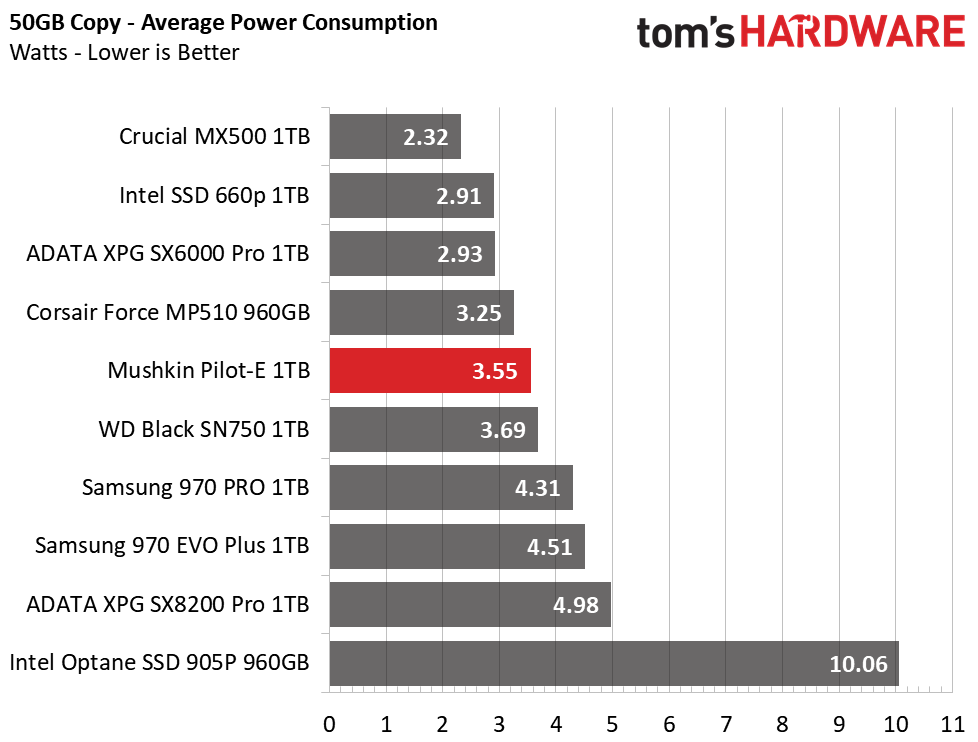 The Pilot-E sips very little power at idle, just 12mW when ASPM is enabled in our BIOS, similar to other Silicon Motion based SSDs. It wasn’t quite as fast as the Adata XPG SX8200 Pro during our file copy test, but on average it consumes less power, which propels the Pilot-E to second place on our efficiency chart. Unlike the Adata, this Mushkin drive isn’t wasting power trying for the best performance; it's quite balanced.