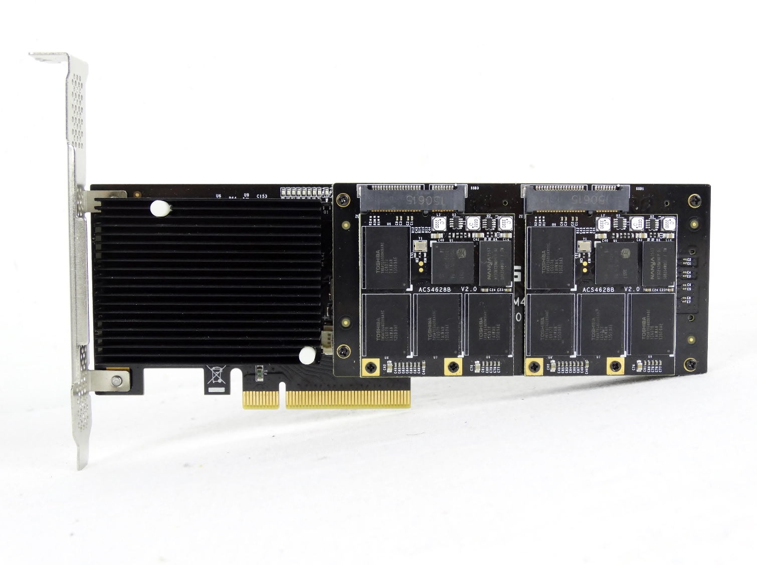 An Avago (formally LSI) SAS 3008 hardware RAID controller serves as the heart of the system. The controller allows users to run RAID 0, 1, 1E or 10, but it does not support RAID 5 or 6. It also does not support JBOD (Just a Bunch Of Disks) with the MX firmware installed, but you can flash the firmware to IT mode to gain JBOD functionality. JBOD mode allows you to address the storage pool as eight single 256GB SSDs. A quick internet search discloses the procedure to flash the SAS 3008 firmware into IT passive mode. If you hack the card to IT mode using firmware built for other Avago-based products it would most likely void your warranty.
