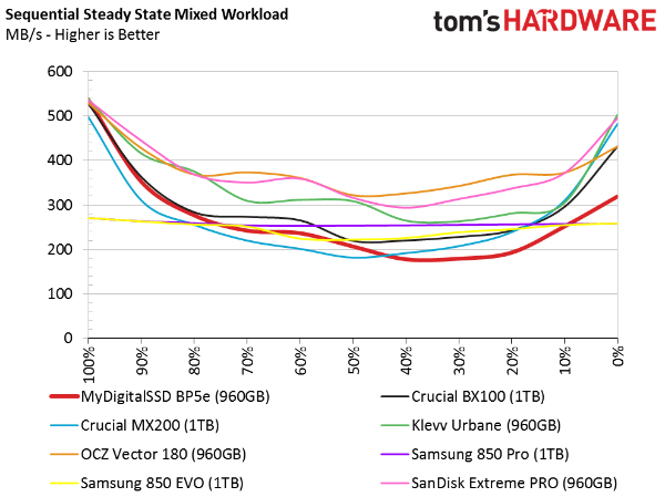 The upswing we see when the graph gets to 100 percent sequential writes shows just how much Phison has improved performance with TLC flash. If you look back at the Adata SP550 review, there are several examples of what we more commonly associate with TLC in steady state using the same test. After the 80 percent read measurement, most TLC-based drives level out under 100 MB/s and never recover. Not only does the BP5e stage a recovery, but it also keeps performance north of 200 MB/s through most of our benchmark.