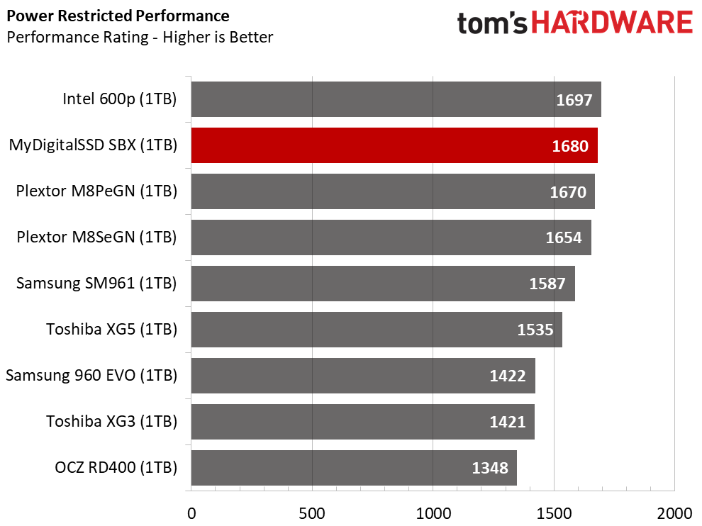 While a notebook is on battery power, the CPU, system memory, and interfaces all run in a reduced power state. With default power settings, the SSD is not as fast or as responsive under these conditions. The MyDigitalSSD SBX delivers the same battery time as the Intel 600p.