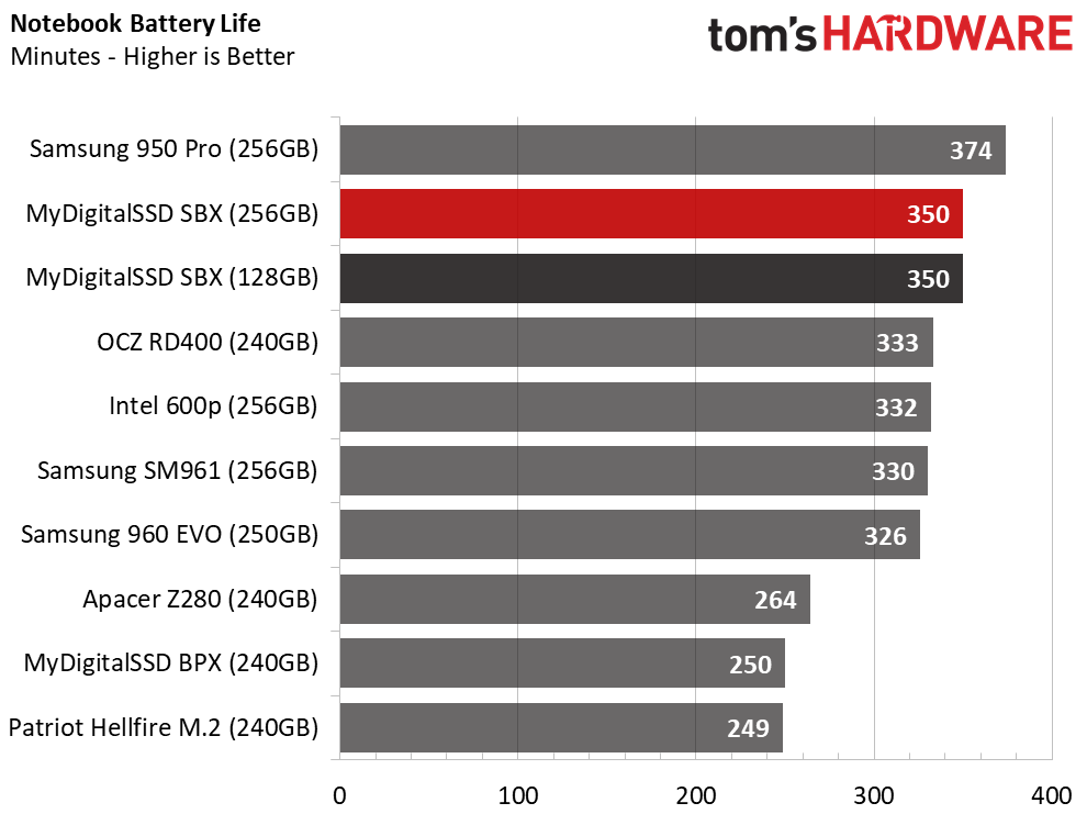 The 128GB and 256GB SBX drives both lasted 350 minutes in our notebook battery life test. That beats the two higher-capacity models. We're using a gaming-focused Lenovo Y700-17 notebook, but the business-focused Lenovo Carbon series would provide much more battery life. The Y700-17 is the first platform that allowed us to standardize on a system that supports both NVMe and SATA.