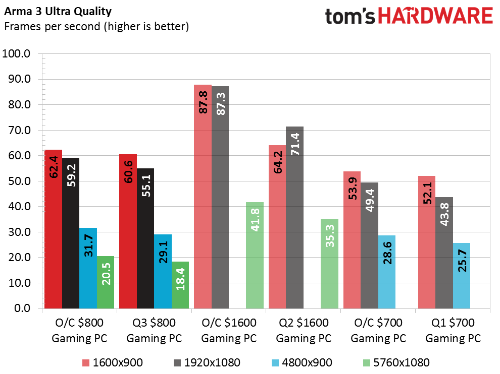 Overall, we see only a mediocre improvement in frame rates compared to the Q1 build. In most cases, the extra frames aren't going to make much of a difference, especially at low settings. At the very least, the extra graphics power does get us back up to playable framerates at the wider resolutions, like 4800x900 and 5760x1080. As expected, there's a very clear difference between this quarter's build and last quarter's $1,600 build.