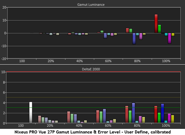 sRGB improves the average error to 4.24dE, and User Define takes that further, to 3.89dE, if you don’t make further changes. Our calibration takes the error to a morecompetitive 1.19dE. That number would be much lower if not for the blue error at 100%. Though the Nixeus finishes last in this group, its potential for accuracy is as good as most displays can boast.