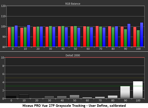 All the monitors here have tight gamma tracking, so the Nixeus’ .28 result is quite good when compared to a larger data set. If it tracked better at 80 and 90%, it’d be on top for sure. With an average value of 2.25, the PRO Vue 27P only misses the 2.2 standard by 2.27%. That’s enough to propel it ahead of three other screens here.