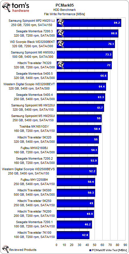 The Windows XP startup benchmark combines access capabilities and high throughput, and can be considered very relevant to drive use in everyday life. This time, the Hitachi Travelstar 7K320 provides the best results, but WD’s Scorpio, which has the quickest access time, follows close behind. Seagate scores only a good result, and does not even outperform its predecessor, most likely because its access time is a bit longer with the Momentus 7200.3.