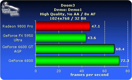 While the GeForce FX 5950 Ultra has to yield to the Radeon 9800 Pro in Doom3, the 6600 GT really shows what it can do here. Note that in the high-quality setting in Doom3, 8x anisotropic filtering is activated by default.