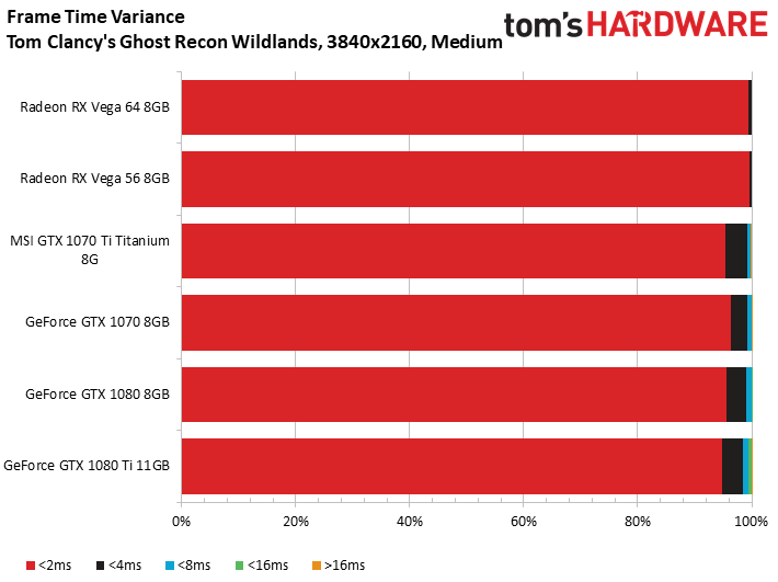 GeForce GTX 1070 and Radeon RX Vega 56 trade blows in Ghost Recon Wildlands, so it’s hardly a surprise that GeForce GTX 1070 Ti is ~14% faster than AMD’s card. Although we’re testing with new drivers from both manufacturers, these results largely mirror what we were seeing a couple of months back.