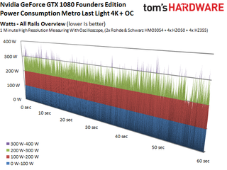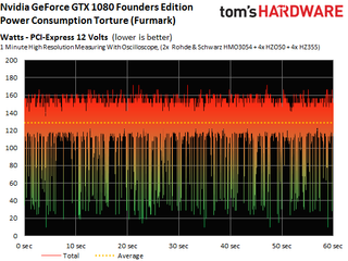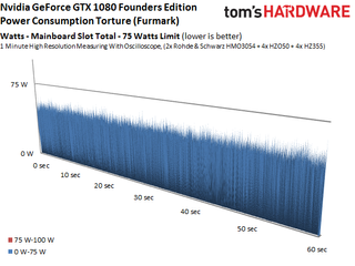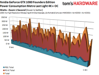 Spikes above 300W are a thing of the past. Nvidia’s GeForce GTX 1080 barely has any, whereas they were a lot more frequent on the 980. Overall, even though these cards post almost identical averages, the GeForce GTX 1080’s curve is both smoother and more dense.