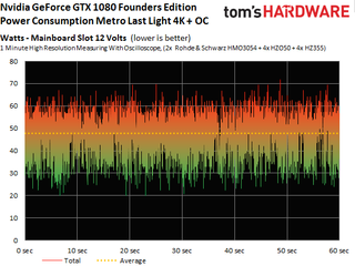 The numbers get more interesting as we measure power consumption while running a loop of Metro: Last Light at Ultra HD. After the graphics card warms up to a toasty 84 degrees Celsius (10 degrees under its thermal threshold), power consumption registers 173W. Prior to the warm-up phase, we were seeing 178W, which is the limit defined in Nvidia's BIOS. In other words, the company was right on with its 180W TDP rating.