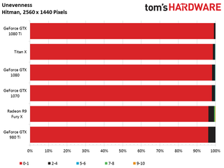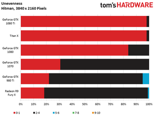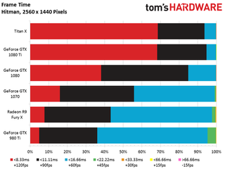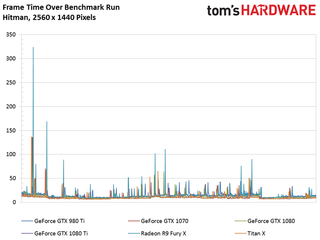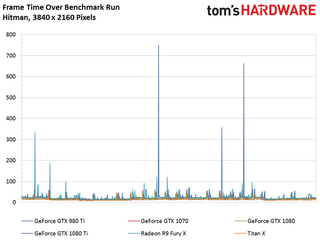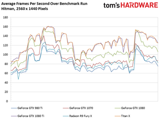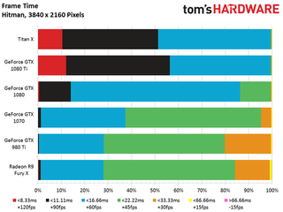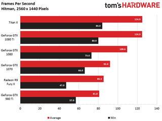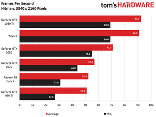 The GeForce GTX 1080 Ti matches the Titan X in our Hitman benchmark, and turns in an average frame rate just 14% faster than 1080.