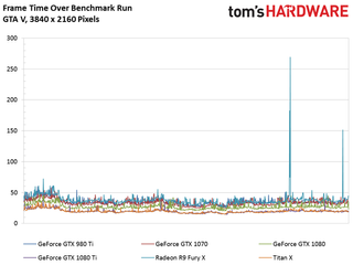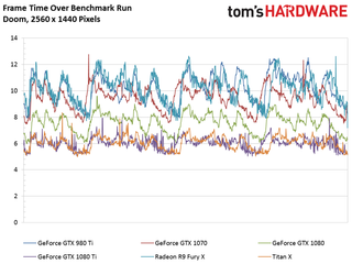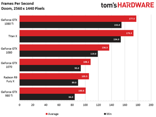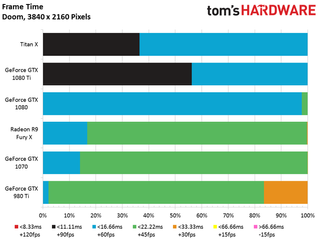 A more resource-laden GPU allows the 1080 Ti to outperform Nvidia’s vanilla 1080 by 34%. It’s a full 88% faster than last generation’s GeForce GTX 980 Ti. And although a higher resolution helps AMD’s Radeon R9 Fury X beat both the GeForce GTX 980 Ti and 1070, 1080 Ti is still 68% faster than the Fiji-based flagship.