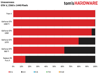 As we’ve seen over the past year, DirectX 12 tends to paint AMD’s Graphics Core Next architecture in a favorable light. Radeon cards typically don’t fare as well in DirectX 11-based titles, though. Consequently, GeForce GTX 1080 Ti establishes its largest lead yet (89%) over the Radeon R9 Fury X in GTA V, the first DX11 game we’ve encountered.
