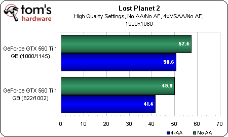 As you can see, the GeForce GTX 560 Ti running at 1 GHz is substantially faster than the board Nvidia sent over. It’s not quite as fast as a GeForce GTX 570, like Gigabyte claims, but the fact that it’s close, for $80 less, is pretty darned crazy.