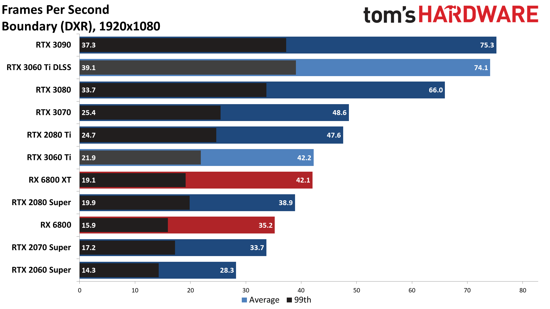 Given what we've seen so far, it's a safe bet that the RTX 3060 Ti will be about as good as the RTX 2080 Super when it comes to ray tracing performance. We've tested most DXR-capable GPUs from AMD and Nvidia, omitting only the Titan RTX and the non-Super 20-series GPUs.