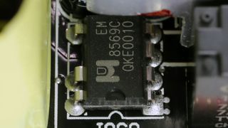 The 5VSB circuit's PWM controller is an Excelliance MOS EM8569. On the secondary side of this circuit, a Schottky Barrier Diode (SBR) is used, so inevitably efficiency will take a hit.