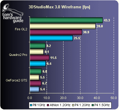This test uses complex wire frame models without any shading or texture. CAD users who often create technical drawings will find this a very revealing test for pure construction work. With wire frame models, Quadro2 Pro has no chance at all.