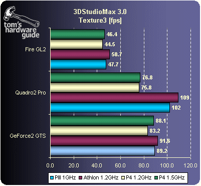 Texture3.MAX requires the graphics card to use a giant texture map for calculating constantly reshaping geometry. In this test Quadro2 Pro and even GeForce2 GTS are able to show their superior texture performance.