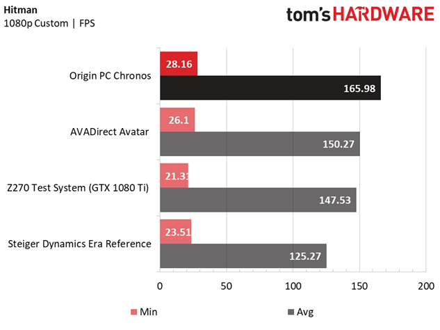 The Origin PC Chronos continues its gaming dominance in the Direct3D 12 version of the Hitman benchmark, earning top honors in the group of Z270/GTX 1080 Ti gaming rigs. At 1920 x 1080, the Chronos outperforms the Avatar by over 15 FPS average and nets a better minimum framerate by just about 2 FPS. The lead becomes less pronounced as you turn up the resolution (about 11 FPS at 2560 x 1440, 4 FPS at 4K), but the Chronos maintains its lead.