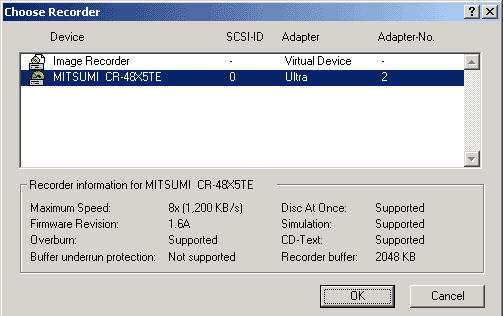This Mitsumi burner supports all important features except for the "burn proof" function. The decisive feature: "Overburn". The NERO 5.5 burner software is shown in the picture.