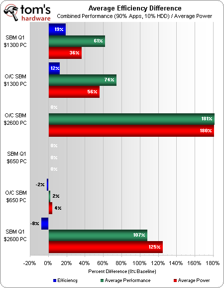 Surprisingly, the $2600 PC actually reaches baseline efficiency when it's overclocked, even though moderate CPU voltage increases were required. The $1300 build shines brightest however, combining an efficient Sandy Bridge quad-core processor with AMD’s moderately-efficient Radeon HD 7970 graphics card.