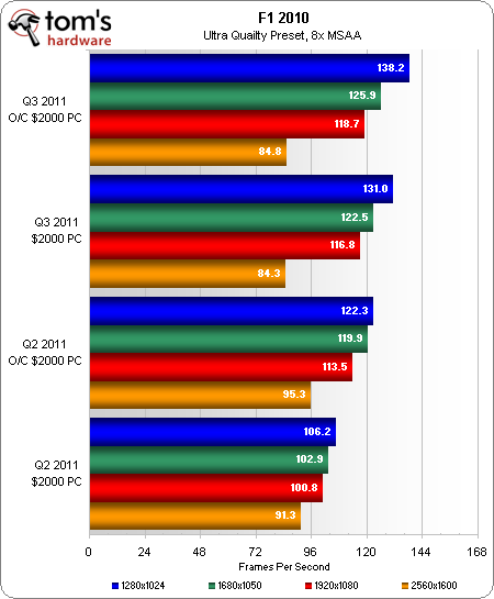 The new cards come up short in F1 2010’s highest test setting. Yet, the average of all results still favors our new build.
