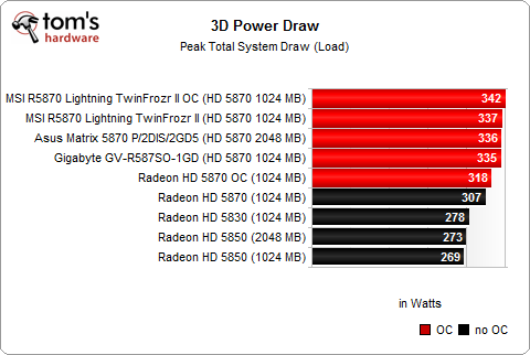 We decided to run a few additional tests with several other, factory-overclocked graphics cards because we wanted to be sure that the results we’ve been seeing on MSI’s R5870 Lightning TwinFrozr II would apply to other boards with aftermarket enhancements as well. The two other cards also reduce clock speeds at idle, so long as they operate at their preset clock speed settings--we can be sure because the GPU temperatures stay below 45°C.