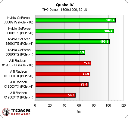 The situation is different in Quake 4. Here, both the ATI Radeon X1900 XTX and the Nvidia GeForce 8800 GTS perform adequately at x4 PCI Express speeds, and gain only a little by running at x8 or x16.