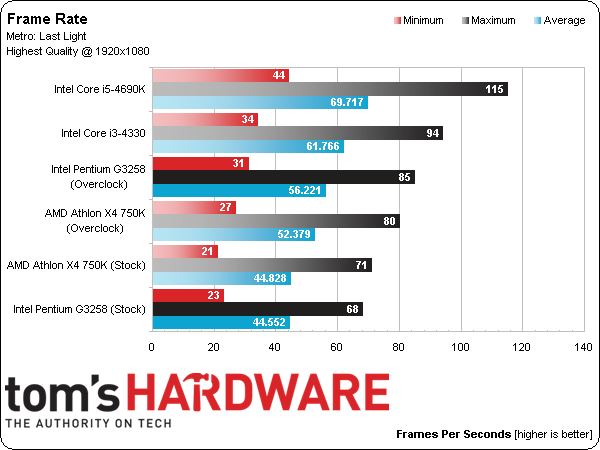 The stock Pentium and Athlon suffer minimums that approach 20 FPS, while the overclocked chips are closer to 30 FPS. Meanwhile, the Core i5-4690K achieves a minimum frame rate of 44, demonstrating the importance of balance. Without question, overclocking the quad-core i5 would unlock even more of the GK110 GPU’s potential in this title.