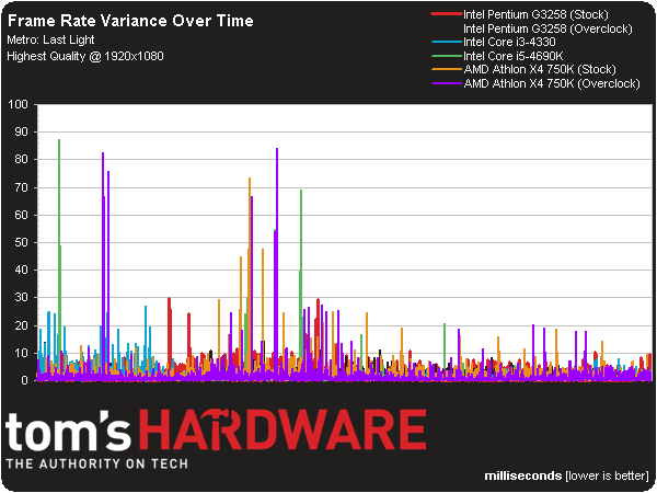 Frame time variance in Metro registers a little higher than the games we’ve tested thus far, but it’s not severe. The stock Pentium and Athlon fare worst; the performance benefits conferred by overclocking help reduce variance, also.