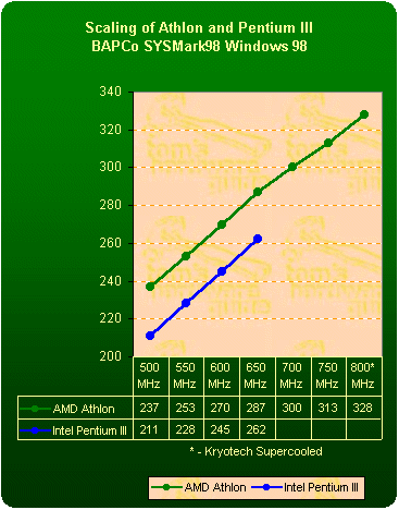 The scaling of Sysmark98 under Windows98 is pretty much identical as under Windows NT, only that the NT-scores are higher, as we know for a long while. NT is a real operating system while Windows98 is still the toy-OS. This might finally change with Windows2000, thanks almighty Microsoft! Up to 650 MHz both CPUs scale close to perfectly linearly, above that the Athlon scores may be impacted by the hard drive speed, less likely the memory bus speed. It's interesting to note that the gradient of Athlon and Pentium III is identical. Pentium III at 650 MHz can pass Athlon at 550 but not even reach Athlon 600.