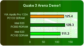 Intel's 820 w/RDRAM is the leader of the pack, but VIA's Apollo Pro 133A is close behind it. i820 w/SDRAM is far behind the two and shows once more that 820 plus SDRAM is no real alternative.