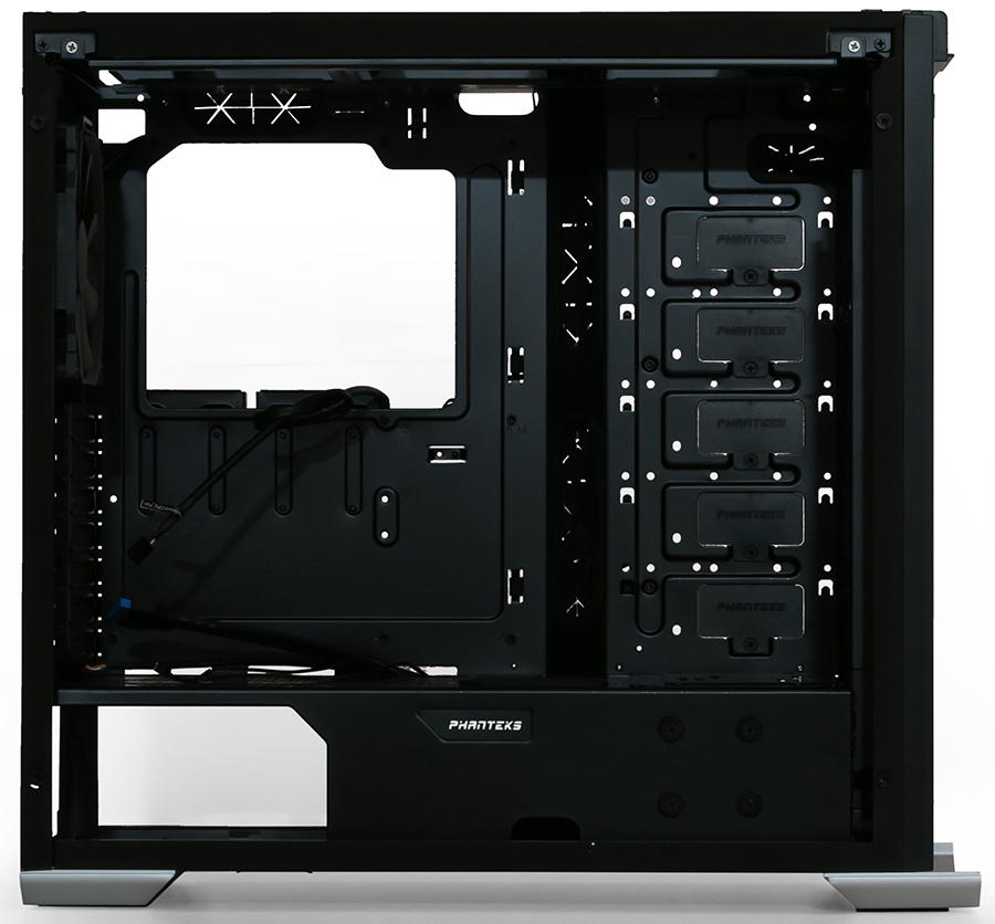 There isn't any clearance above the radiator tray for additional fans, but the radiator mounts are offset towards the left for additional motherboard clearance. Phanteks was kind enough to provide motherboard clearance dimensions of 2.68" with a 120mm-wide radiator installed, and 1.89" with a 140mm radiator installed. Quoted as DIMM clearance, these dimensions are measured from the surface of the motherboard to the closest radiator fan.