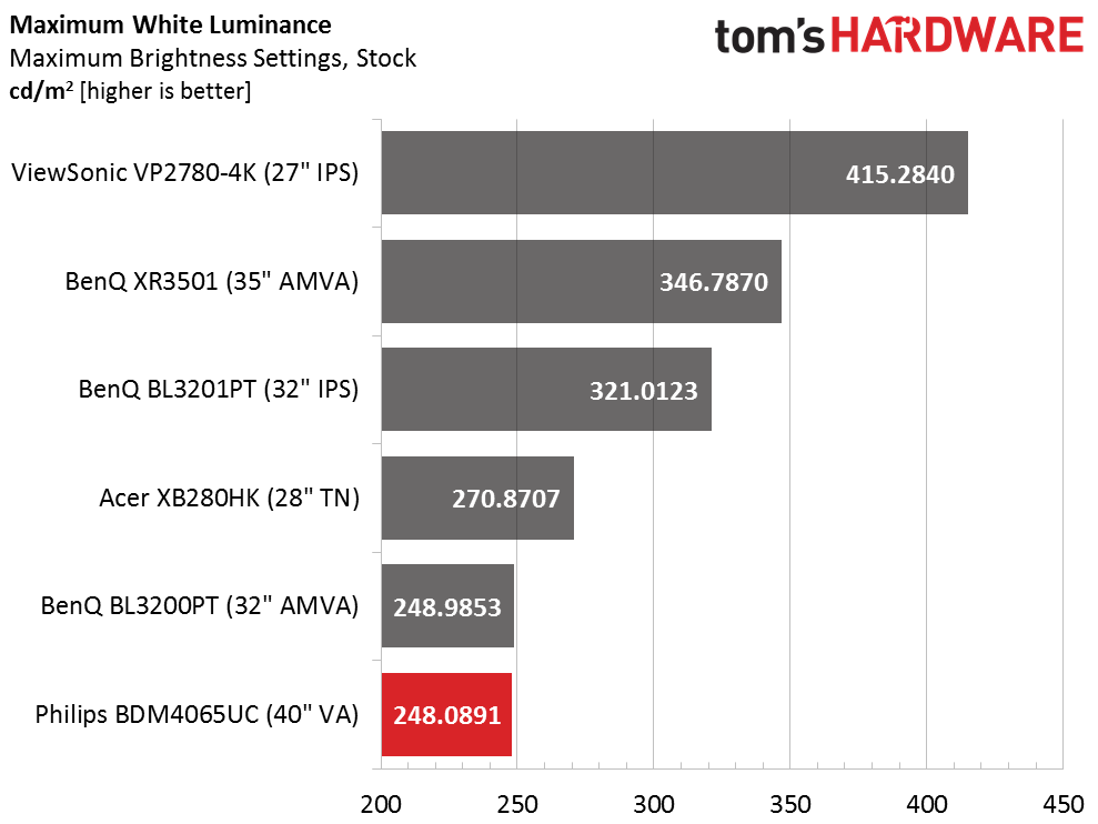 Philips claims 300cd/m2 for the BDM4065UC but we could only get it to a touch over 248. It’s not the brightest display out there but it’s bright enough. Once you see how good the blacks are, output won’t be on the radar.